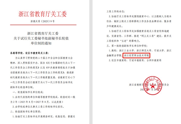 近日,省教育厅关心下一代工作委员会发布《关于试行关工委秘书处副秘书长轮值单位制的通知》,公布第一批轮值副秘书长单位和学校。我校与浙江工业大学等5家高校入选第一批轮值副秘书长学校。