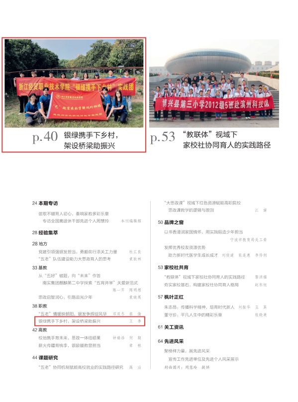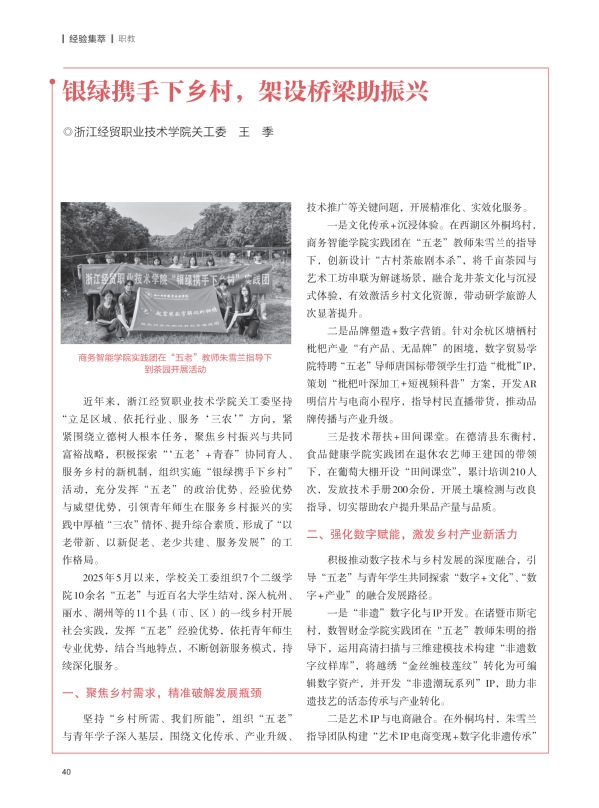 近年来,浙江经贸职业技术学院关工委坚持“立足区域、依托行业、服务‘三农’”方向,紧紧围绕立德树人根本任务,聚焦乡村振兴与共同富裕战略,积极探索“‘五老’+青春”协同育人、服务乡村的新机制,组织实施“银绿携手下乡村”活动,充分发挥“五老”的政治优势、经验优势与威望优势,引领青年师生在服务乡村振兴的实践中厚植“三农”情怀、提升综合素质,形成了“以老带新、以新促老、老少共建、服务发展”的工作格局。