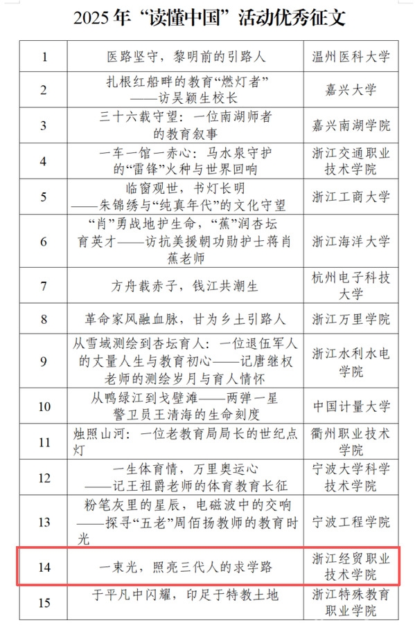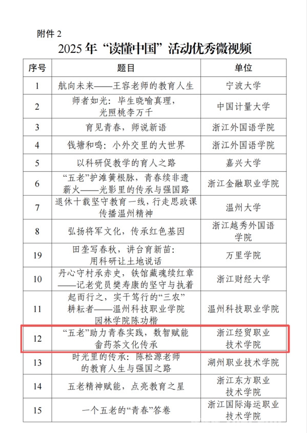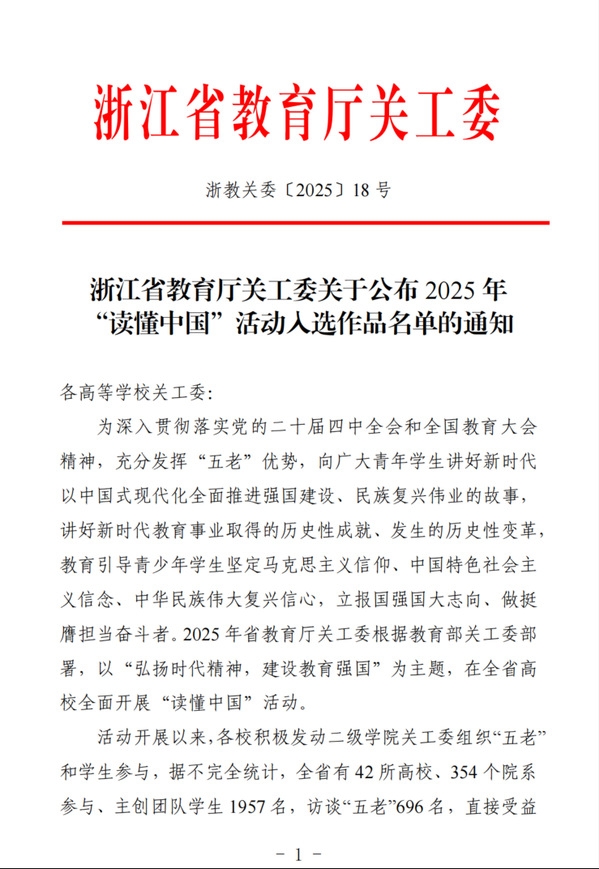 近日,浙江省教育厅关工委公布了2025年“读懂中国”活动入选作品名单。此次省教育厅关工委面向高等院校征集“读懂中国”活动优秀作品,全省共有42所高校积极参与,提交征文、微视频、舞台剧等各类作品820件。经专家评审,省教育厅关工委主任办公会研究,我校申报的两件作品入选优秀作品名单。